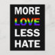 Cartões-postais Mais Amor Menos Ódio com um texto branco ousado sobre fundo preto, e um padrão arco-íris na palavra amor.