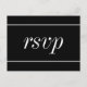 Este clássico design de cartão postal R.S.V.P apresenta a mensagem "rsvp" na frente. Ele também apresenta um formulário de RSVP personalizado no verso, juntamente com um endereço personalizado ao qual as placas de RSVP completadas seriam enviadas. Cartões RSVP como este podem ser usados para descobrir quem vai estar participando de um chá de casamento, de uma festa de Natal, de um chá de fraldas, de uma festa de aniversário ou de alguma outra celebração.