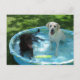 Chocolate e laboratórios amarelos em piscina de água plástica com seu brinquedo.