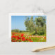 Cartão postal de uma oliveira antiga num cheio de papoila vibrante vermelho num campo de papoila numa paisagem na Toscana, Itália com o texto: "Toscana".