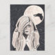 Pequeno Chapeuzinho Vermelho, caminhando pela floresta, o lobo está à distância. Aquarelas preto e branco.
