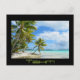 Cartão-postal com palmeira pendurada numa praia de areia branca numa pequena ilha deserta na lagoa azul de Rangiroa tropical, um atolal do arquipélago do Tahiti Polinésia Francesa no oceano Pacífico com uma fronteira negra e o texto: Tahiti.