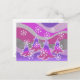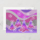 Uma paisagem de inverno moderna e estilizada com pinheiros foscos e flocos de neve espumantes. Cartão-postal com uma cinza prata roxa, rosa, e design branco personalizável para você personalizar com seu próprio texto, imagens e ideias. Um lápis colorido digitalmente melhorado por Jess Perry.