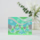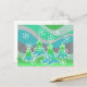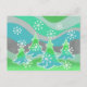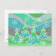 Uma paisagem de inverno moderna e estilizada com pinheiros foscos e flocos de neve espumantes. Cartão postal com uma cinza verde, azul, prata e design branco personalizável para você personalizar com seu próprio texto, imagens e ideias. Um lápis colorido digitalmente melhorado por Jess Perry.
