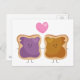 Manteiga de amendoim e geleia adoram cartão postal - manteiga de amendoim e geleia no pão, de mãos dadas com um grande coração rosa sobre elas.