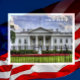 "O Pórtico Sul da Casa Branca ergue-se contra um céu azul e nublado. Suas quatro colunas icônicas, gramado bem cuidado, fonte rodeada por rosas cor-de-rosa e um portão de ferro forjado refletem a elegância e grandiosidade desta casa presidencial, um verdadeiro símbolo do coração da nação."