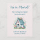Diga bem-vindos a casa com o cartão postal "Nós nos movemos" - uma mistura encantadora da natureza e chorona! Apresentando um gráfico delicioso de uma acolhedora casa de pássaros cercada por flores florescentes e um adorável pássaro rosa e azul, este item adiciona um toque de doçura a qualquer espaço. O elegante script azul e as fontes serif são totalmente personalizáveis, fazer cada convite exclusivamente seu. Perfeito por avisar a todos que você se mudou para um novo ninho, trazer calor, charme e um traço de beleza inspirada na natureza para o seu anúncio. Personalize o seu hoje! Texto de personalização editável ou removível