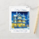 Casa sazonal de inverno iluminada em uma noite de neve personalizada cartão postal de Natal.