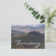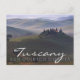 Cartão postal de uma fazenda, no nevoeiro matinal, à madrugada do amanhecer na Toscana, entre as colinas rolantes do Vale de Val d’Orcia entre Pienza e San Quirico d’Orcia, em Itália, com o seguinte texto: "Toscana, San Quirico d'Orcia".
