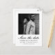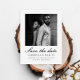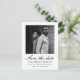 Simples e elegante casamento de duas fotos, preto e branco, salve a data em que o postal do anúncio apresenta um belo roteiro de caligrafia na frente com uma foto, e uma segunda foto em forma de arquivo com detalhes do site do casamento e endereço de retorno na parte de trás do clássico cartão-postal do anúncio do casamento. Compre esta coleção de casamentos de chic para coordenar convites de casamento e opções de cores modernas adicionais.