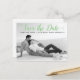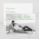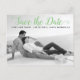 Casamento com guião verde moderno Salve o cartão postal da foto de Data. Esta tipografia contemporânea Save the Date design apresenta uma foto em preto-e-branco do casal e o texto "Save the Date" (Salvar a data) em uma fonte moderna de script.