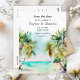 Esta elegante e bela aquarela, exceto a data do convite, apresenta uma praia, céu azul e palmeiras. O texto combina o script manuscrito e as fontes sans serif para uma aparência na moda e moderna. Isto é perfeito para uma praia de verão ou um casamento de destino tropical.