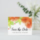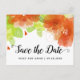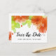 Caligrafia manuscrita com script e flores etéreas laranja casamento outono floral Salve o cartão-postal Data. A parte superior é coberta por flores laranja bonito e folhas verdes.