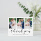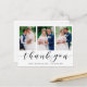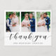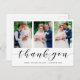 Envie um cartões de agradecimentos personalizado moderno de colagem de fotos para sua família e amigos para obrigado-los para participar do seu casamento. Este elegante modelo de design apresenta três das suas fotos de casamento enquadradas em branco. Abaixo, no roteiro de caligrafia, lê-se "Obrigado" com seu nome e data para você personalizar. A parte de trás do cartão tem uma mensagem e uma assinatura acentuadas por um som de cor d'água eucalipto verde. Foi uma alegria criar por você. Parabéns pelo seu casamento! Desenhado pela artista ©Susan Coffey.