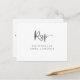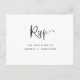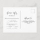 Esses cartões-postais de resposta RSVP de casamento modernos, simples e elegantes apresentam um design de texto minimalista preto e branco com letra manuscrita estilosa. Há espaço para adicionar as opções dos seus convidados para a escolha da refeição ou jantar. O texto é mantido afastado das bordas superior e inferior do verso do cartão-postal, para diminuir a chance de ser coberto no topo e na parte inferior por marcações postais.