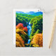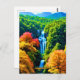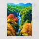 Uma serena cascata chinesa aninhada em meio à bela natureza, cercada por árvores e montanhas coloridas.