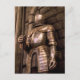 Uma foto de um Cavaleiro de terno dos tempos medievais. Ele está guarda em frente a uma velha porta do castelo.