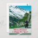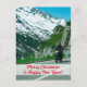 Cartaz de Natal para motociclistas tem uma foto de um motociclista em montanhas de neve. O texto na parte inferior diz Feliz Natal e Feliz ano novo, ou edite para sua própria saudação personalizada.