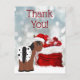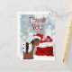 Este cartão de agradecimento apresenta um cavalo Appaloosa de cobertor fofo vestindo um chapéu de Papai Noel em pé com um grande saco de presentes na neve.