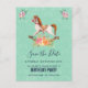 Cartão postal de salve a data de festa com uma imagem encantadora e fantasiosa de um cavalo mecânico antigo com um buquê floral extravagante em rosa e amarelo. O fundo é um padrão de damasco xadrez verde claro.