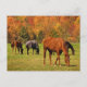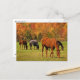Este cartão-postal apresenta uma fotografia de arte de uma bela paisagem rural de outono, com cavalos a pastar a grama verde. Uma colina fica atrás delas em gloriosas cores de folhagem de vermelho, laranja, ouro, amarelo, marrom e verde.