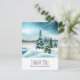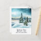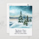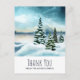 Cartão de agradecimento com uma bela pintura em aquarela. Árvores de pinheiro cobertas de neve em uma cena invernal. Flocos de neve caindo sobre um chão coberto de neve. Nuvens fofas brancas e azuis no céu. Com um lago congelado ao fundo. Vibração pacífica e sombria.