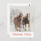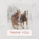 Um cartão postal de agradecimento com uma fotografia ao ar livre apresentando uma equipe de 2 cavalos de tração belgas puxando um trenó. Flocos de neve caindo suavemente com pinheiros cobertos de neve ao fundo. No verso, uma ilustração de 2 cervos saltando com coloração xadrez vermelha acima do seu texto personalizado.