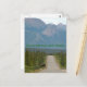 Vista cênica do Parque Nacional Denali. Há montanhas maravilhosas ao fundo e um alce que atravessa a estrada do parque.