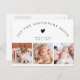 Crie seu próprio cartão postal de agradecimento com colagem de fotos para o chá de bebê para agradecer amigos e familiares por receberem seu pequeno! O design elegante e minimalista apresenta uma colagem de três fotos personalizadas na parte inferior e tipografia elegante na parte superior com um cabeçalho significativo "que a aventura comece" em um arco sofisticado e as informações do seu bebê em tipografia clássica. Há também um pequeno coração fofo. No verso, há uma mensagem personalizável com seus nomes e um endereço de devolução. Torne-o único substituindo o texto e as imagens clicando no botão "Personalizar".