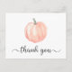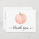 Um obrigado de queda livre, neutro em termos de gênero, que você faz com que o seu cartão postal apresente uma cor d'água cor de laranja pastel de uma abóbora e "obrigado você" em um roteiro de cinza com balsas. No verso, personalize o seu obrigado através de mensagem e assinatura, ou deixe o vazio para uma nota manuscrita.
