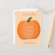 Esta incrível salvação do cartão postal do Chá de fraldas apresenta uma imagem de arte digital de uma abóbora laranja fofa com 3 tons de laranja diferentes ficando mais escuros em direção às bordas da abóbora. Há um pé verde anexado ao topo. O design é um fazer neutro em relação ao gênero, é um design perfeito para celebrar um menino ou uma menina, especialmente no Dia de Ação de Graças. Há texto personalizado para que você possa incluir a data do Chá de fraldas e personalizar o design, como quiser.