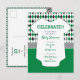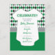 Um padrão elegante e sobredimensionado de estilo nas cores escolares de verde e preto é o pano de fundo para este design chá de fraldas bonito. Uma roupa branca para bebês tem todo o texto escrito nela para o grande evento, que pode ser um chá casal ou apenas para a mãe. O design vem em marrom e cinza, laranja e cinza queimadas, vermelho e preto, verde e preto, laranja e marinho, verde e amarelo, roxo e cinza. Produtos correspondentes disponíveis.
