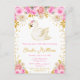 Este convite de chá de fraldas giro e caprichoso apresenta um elegante swan e rosas rosa arranjos florais com falso confete de brilho dourado. O texto combina o script manuscrito e as fontes sans serif para uma aparência na moda e moderna. Isto é perfeito para um chá de fraldas temático cisne. Gráficos por Heideramalice e SunflowerDayLove