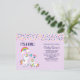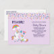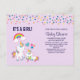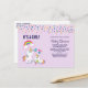 É um convite postal de chá de fraldas feminino. Projetado com um unicórnio branco com rico colorido e cauda. Um unicórnio bebê deitado ao seu lado, com um pacificador verde na boca. Um arco-íris colorido com nuvens lisas, e algumas estrelas e corações decoram este doce e adorável design. Um contorno cor-de-rosa em negrito ao redor da imagem lhe dá uma vibração de rabisco em forma de criança. Fundo roxo claro. Pontos de confete coloridos ao longo do topo.