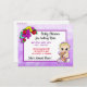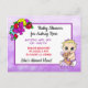 Bebê bonito com ursinho de pelúcia, cor rosa, roxo e vermelho acentos com arcos e flores chá de fraldas de barato com convite postal. Garotinha com cabelo loiro.