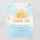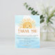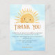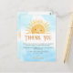 Obrigado familiar e amigos por terem vindo ao seu chá de fraldas com este obrigado de chá de fraldas giro que você faz. Diz obrigado na tipografia na moda com um adorável sol amarelo de aquarela num fundo azul-céu. A mensagem é personalizável. Original Watercolor © Michele Davies.