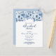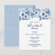 Na frente: Um clássico fundo branco chic. Decorados com flores aquáticas, florais em tons de azul. Modelos para o nome da noiva e detalhes da festa. O nome e o texto: Bridal são escritos com um script de estilo manuscrito, letras azuis coloridas. Fundo: cor azul empoeirada de fundo. Dica: Se você não quiser que pareça um cartão postal, clique em personalizar, vá para o verso e remova o divisor e o carimbo de posto.