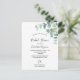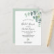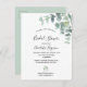Um fundo branco chic. Decorado com eucalipto branco verde, folhas e prigos. Personalize e adicione um nome e detalhes da parte. Letras negras. O texto: Chá de panela e o nome da noiva são escritos com um moderno estilo escrito à mão. Verso: cor verde do fundo.