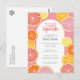 Frutas cítricas caprichosas em cores de limão, rosa, coral, laranja e toranja vermelha rubi. As fatias de cítricos desenhadas à mão incluem uma textura pintada à aquarela para uma adição suculenta ao convite do chá de casamento colorido.