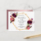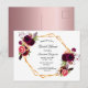 Na frente: um fundo branco elegante com uma estrutura geométrica dourada falsa. Decorados com flores, rosas e penas do estilo "boho" escuras e burguesas. Modelos para o nome da noiva e detalhes da festa. O nome é escrito com um script de estilo manuscrito, letras pretas. Traseiro: um fundo de aparência metálica suja e poeirenta rosa. Dica: Se você não quiser que pareça um cartão postal, clique em personalizar, vá para o verso e remova o divisor e o carimbo de posto.