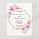 Um convite para noivas tropicais elegante. Com uma falsa estrutura geométrica de ouro decorada com hibisco de rosas claro, flores tropicais com um pouco de verde. Cor de fundo branca. O texto: o Chá de panela e o nome da noiva são escritos com um script de estilo moderno e manchado. Texto preto. Traseiro: cor de fundo rosa. Dica: Se você não quiser que pareça um cartão postal, clique em personalizar, vá para o verso e remova o divisor e o carimbo de posto.