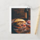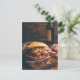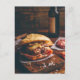 Cheeseburger com carne de vaca, queijo swiss de Wisconsin, presunto, cogumelos saudados, mostarda de dijon, maionese e rolo de batata. Garrafa de cerveja artesanato e empada crua ao fundo.