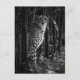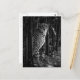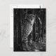 Um cartão postal com uma foto branca e negra de um guepardo parado em bambu.