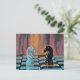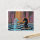 Este design de cartão-postal de xadrez apresenta cavaleiros clássicos de peça de xadrez num conselho de xadrez com estilo pop.