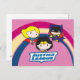 Check out Chibi Supergirl, Chibi Wonder Woman, and Chibi Batgirl in front of a rainbow extending from a blue Justice League logo.