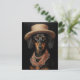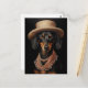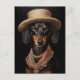 Retrato de um dachshund super elegante com um chapéu de creme de rico, cachecol rosa e pérolas