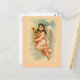 Linda imagem de vintage de um anjo infantil de cabelos escuros vestido de rosa com uma coroa floral amarela na cabeça e seu harpa de carregando.
