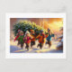 Six children in colorful winter clothing carry a large Christmas tree through a snowy landscape. A warm sunset lights the scene, creating a playful and joyful atmosphere.