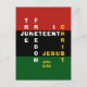 Cartão postal Christian JUNETEENTH em cores pan-africanas. Na moda JUNETEENTH design com referência à Bíblia cristã, mostrando a citação inspiradora TRUE FREEDOM IN CRISTO JESUS num formato de palavras cruzadas incluindo JUNETEENTH, e é colocada contra painéis vermelhos, pretos e verdes (RBG cores do PAN AFRICAN FLAG). O texto principal baseia-se na referência das Escrituras de John 8:36 - O ELE QUE O FILHO (JESUS) DEFINE LIVRE É LIVRE DE FATO. A referência de Bíblia JOHN 8:36 é PERSONALIZÁVEL, portanto você pode substituir o texto por suas INICIAIS ou NOME. Este cartão postal de 19 de junho seria uma forma excelente de ajudar a comemorar o 11 de junho para os afro-americanos. Esteja preparado para compartilhar sua fé, pois isso também faria uma conversa de excelente começar.