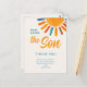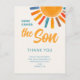 Agradeça familiares e amigos pelos presentes no seu chá de bebê com tema solar com este lindo cartão de agradecimento. Ele apresenta o texto "Aqui Vem o Filho" em tipografia estilosa com um sol aquarelado em cores vibrantes sobre um fundo creme suave. Fácilmente personalizável. Aquarela Original © Michele Davies.